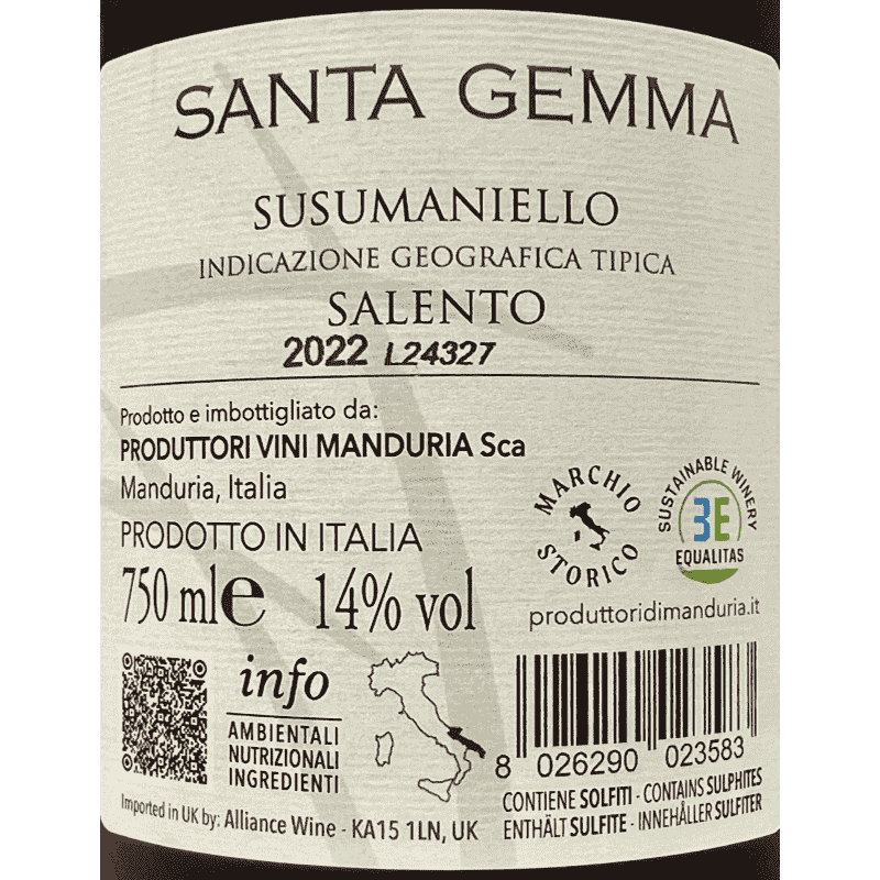 Susumaniello Santa Gemma Salento IGP 2022 - Produttori di Manduria
